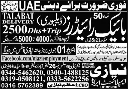 Niazi Employment is looking for candidates for following posts as per job advertisement published in daily Express Newspaper of May 31, 2022 for location Dubai, dubai Dubai: