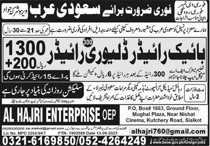 Vacant posts including bike rider, rider and delivery rider are announced in MS Al Hajri Enterprises Riyadh, madina Saudi Arabia as per 5 October 2023 advertisement in daily Express Newspaper. Persons with Matric and Intermediate etc. education can apply.