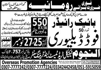 Vacant posts including food delivery rider, bike rider and rider are announced in Al Najoom Technical Trade Test Training Center Romania, romania Romania as per 25 November 2023 advertisement in daily Express Newspaper. Candidates with Intermediate and Matric etc. educational background will be preferred.