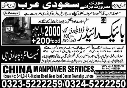 China Manpower Services latest Overseas Driving jobs and others can be applied till 6 February 2024 or as per closing date in newspaper ad. Read complete ad online to know how to apply on latest China Manpower Services job opportunities. Skills in Motorcycle Courier, Courier, Delivery and Food Delivery may be preferred for these China Manpower Services jobs. Salary varies from 152000. Overtime might be allowed. Free medical, food, accommodation and transport may be available.