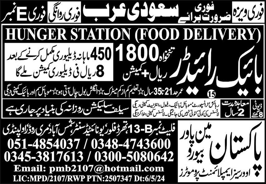 Latest Overseas jobs in Pakistan Manpower Bureau Overseas Employment Promoters in Driving and others can be applied till 4 July 2024 or as per closing date in newspaper ad. Read complete ad online to know how to apply on latest Pakistan Manpower Bureau Overseas Employment Promoters job opportunities. Skills in Motorcycle Courier, Delivery, Food Delivery and Courier may be preferred for these Pakistan Manpower Bureau Overseas Employment Promoters jobs. Salary varies from 132000. Overtime is allowed. Employer provides medical, accommodation and transport facility.