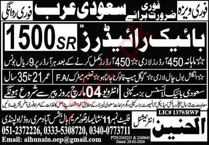 Vacant posts including bike rider are announced in Al Hunain International Makkah, makkah Saudi Arabia as per 3 March 2024 advertisement in daily Express Newspaper. Matric etc. educational qualification will be preferred.
