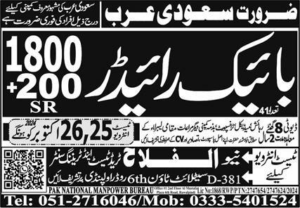 New Alfalah Trade Test and Training Center jobs advertisement dated about 20 October 2024 in daily Express Newspaper invites application for the vacant post of bike rider in Jeddah, jeddah Saudi Arabia. Preferred Education is Matric etc.