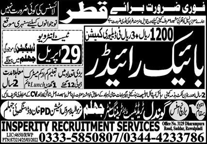 New Gondal Manpower Bureau Qatar, qatar Qatar invites applications from eligible candidates for the post of rider and bike rider as per advertisement of April 28, 2022 published in daily Express Newspaper. Preferred Education is Matric and Intermediate etc.