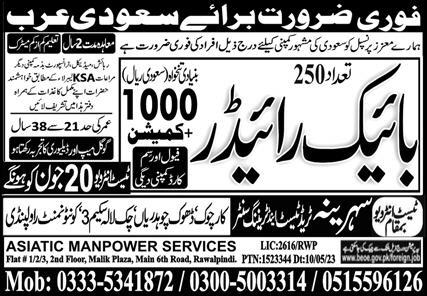 Sehreena Trade Test and Training Center jobs advertisement dated about 14 June 2023 in daily Express Newspaper invites application for the vacant post of biker rider in Riyadh, jeddah Saudi Arabia. Matric etc. educational qualification will be preferred.