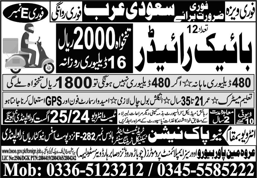 Latest Driving jobs and others Overseas jobs in New Pak Nation Trade Test & Technical Training Center closing date is around August 25, 2024, see exact from ad. Read complete ad online to know how to apply on latest New Pak Nation Trade Test & Technical Training Center job opportunities. Some jobs in New Pak Nation Trade Test & Technical Training Center may require skills like Courier, Motorcycle Courier and Delivery. Salary varies from 148000. Earn extra money with overtime. On job accommodation, transport and medical facility is provided.