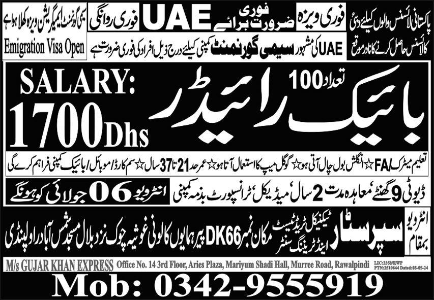 Vacant posts including bike rider and rider are announced in Super Star Technical Trade Test & Training Center Abu Dhabi, sharjah UAE as per 4 July 2024 advertisement in daily Express Newspaper. Persons with Matric etc. education can apply.