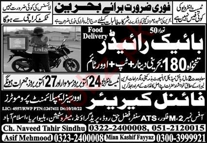 Final Career Overseas Employment jobs advertisement dated about 23 October 2022 in daily Express Newspaper invites application for the vacant post of bike rider in Bahrain, bahrain Bahrain. Intermediate and Matric etc. educational qualification will be preferred.