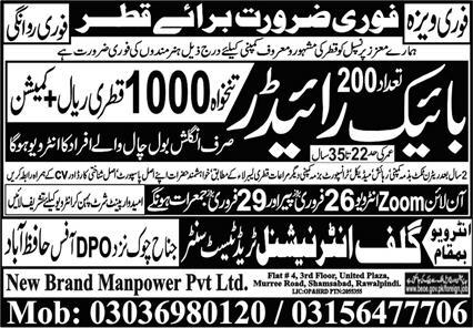 New Brand Manpower Qatar, qatar Qatar invites applications from eligible candidates for the post of bike rider as per advertisement of February 22, 2024 published in daily Express Newspaper. Bachelor, Matric and Intermediate etc. educational qualification will be preferred.