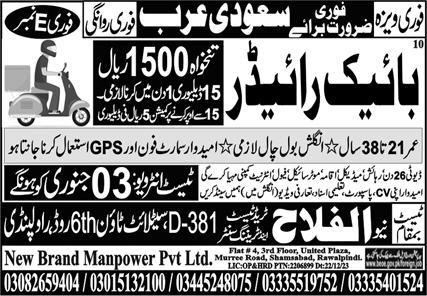 New Brand Manpower jobs advertisement dated about 29 December 2023 in daily Express Newspaper invites application for the vacant post of bike rider in Saudi Arabia, saudi arabia Saudi Arabia. Bachelor, Intermediate and Matric etc. educational qualification will be preferred.