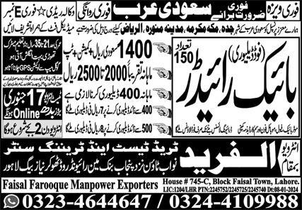 Faisal Farooque Manpower Exporter is looking for candidates for following posts as per job advertisement published in daily Express Newspaper of January 16, 2024 for location Riyadh, riyadh Saudi Arabia: