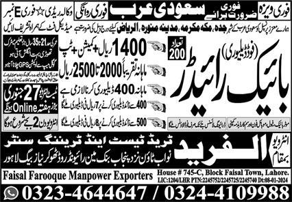 Faisal Farooque Manpower Exporter invites applications for job positions advertised in daily Express dated 27 January 2024 for following vacancies in Riyadh, riyadh Saudi Arabia.