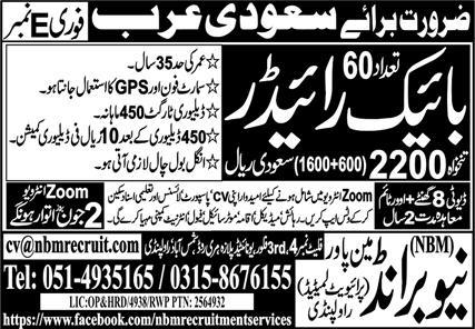 Vacant posts including bike rider are announced in New Brand Manpower Riyadh, riyadh Saudi Arabia as per 29 May 2024 advertisement in daily Express Newspaper. Candidates with Intermediate and Matric etc. educational background will be preferred.
