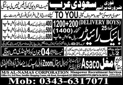 Al Namas Corporation Manpower Recruitment Services invites applications for job positions advertised in daily Express dated 4 June 2024 for following vacancies in Riyadh, riyadh Saudi Arabia.