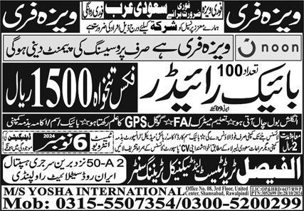 Yosha International Overseas Employment Promoters jobs advertisement dated about 4 November 2024 in daily Express Newspaper invites application for the vacant post of bike rider in Saudi Arabia, saudi arabia Saudi Arabia. Matric and Intermediate etc. educational qualification will be preferred.
