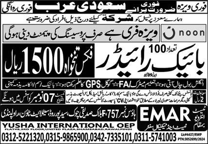Yosha International Overseas Employment Promoters is looking for candidates for following posts as per job advertisement published in daily Express Newspaper of November 6, 2024 for location Saudi Arabia, saudi arabia Saudi Arabia: