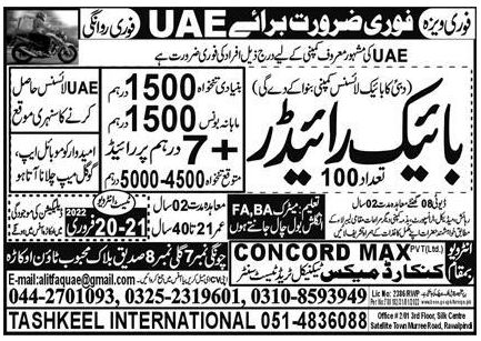 Concord Max Technical Trade Test Center UAE UAE invites applications from eligible candidates for the post of Bike Rider as per advertisement of February 14, 2022 published in daily Express Newspaper. Candidates with Bachelor and Intermediate etc. educational background will be preferred.