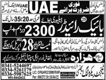 Tangent Recruiting Agency Abu Dhabi, abu dhabi UAE invites applications from eligible candidates for the post of bike rider as per advertisement of April 26, 2022 published in daily Aaj Newspaper. Persons with Intermediate and Matric etc. education can apply.