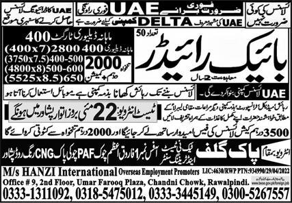 Ms Hanzi International Overseas Employment Promoters jobs advertisement dated about 17 May 2022 in daily Express Newspaper invites application for the vacant post of bike rider in Abu Dhabi, abu dhabi UAE. Educational qualifications required Intermediate and Matric etc.