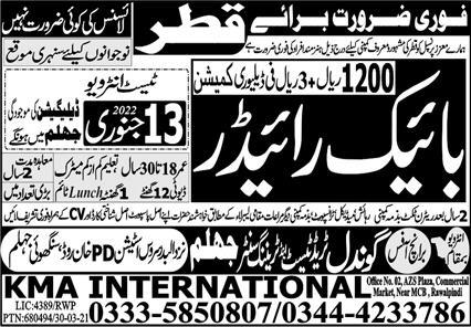 KMA International Company is looking for candidates for following posts as per job advertisement published in daily Express Newspaper of January 12, 2022 for location Qatar Qatar: