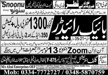 Vacant posts including bike rider and rider are announced in Gulf International Doha, doha Qatar as per 11 November 2025 advertisement in daily Express Newspaper. Educational qualifications required Intermediate and Matric etc.