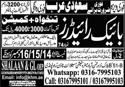 SHALAAN & GL Overseas Employment Promoters jobs advertisement dated about 14 December 2023 in daily Express Newspaper invites application for the vacant post of bike rider and rider in Riyadh, tabuk Saudi Arabia. Persons with Intermediate and Matric etc. education can apply.