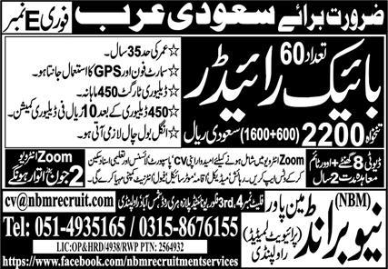 New Brand Manpower Jeddah, taif Saudi Arabia invites applications from eligible candidates for the post of rider and bike rider as per advertisement of May 28, 2024 published in daily Express Newspaper. Persons with Matric etc. education can apply.