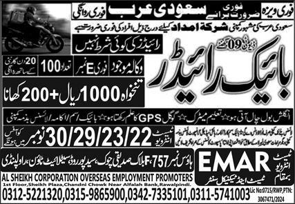 Vacant posts including bike rider and rider are announced in Al Sheikh Corporation Jeddah, dammam Saudi Arabia as per 22 November 2024 advertisement in daily Express Newspaper. Educational qualifications required Matric and Intermediate etc.