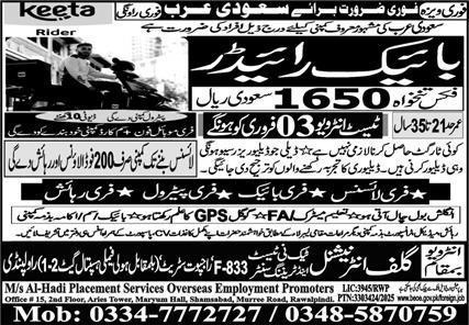 Vacant posts including bike rider and rider are announced in Al Hadi Placement Services Riyadh, makkah Saudi Arabia as per 30 January 2025 advertisement in daily Express Newspaper. Persons with Intermediate and Matric etc. education can apply.