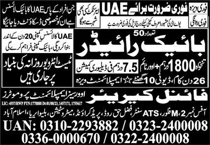 Final Career Overseas Employment jobs advertisement dated about 22 December 2023 in daily Express Newspaper invites application for the vacant post of bike rider and rider in Sharjah, abu dhabi UAE. Persons with Matric etc. education can apply.