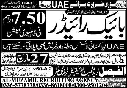 Al Muzamil Recruiting Agency latest Overseas Driving jobs and others can be applied till March 27, 2025 or as per closing date in newspaper ad. Read complete ad online to know how to apply on latest Al Muzamil Recruiting Agency job opportunities.