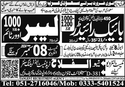 New Al Falah Trade Test & Training Center Dammam, tabuk Saudi Arabia invites applications from eligible candidates for the post of rider, bike rider and labor as per advertisement of September 5, 2024 published in daily Express Newspaper. Educational qualifications required Matric and Middle etc.