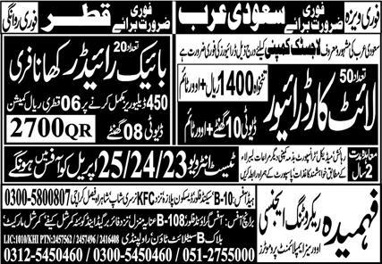 Fahmida Recruiting Agency is looking for candidates for following posts as per job advertisement published in daily Express Newspaper of April 23, 2024 for location Riyadh, dammam Saudi Arabia: