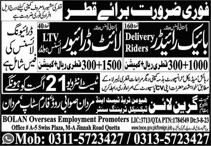 Bolan Overseas Employment Promoters invites applications for job positions advertised in daily Express dated 16 August 2023 for following vacancies in Qatar, qatar Qatar.