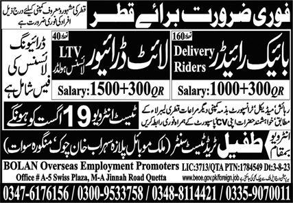 Vacant posts including light driver, ltv driver and bike rider are announced in Bolan Overseas Employment Promoters Qatar, qatar Qatar as per 16 August 2023 advertisement in daily Express Newspaper. Candidates with Matric, Intermediate, Middle and Primary etc. educational background will be preferred.