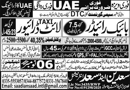 Vacant posts including driver, bike rider, taxi driver, ltv driver and light taxi driver are announced in Saadian & Saad International OEP Abu Dhabi, sharjah UAE as per 5 November 2025 advertisement in daily Express Newspaper. Preferred Education is Matric and Intermediate etc.