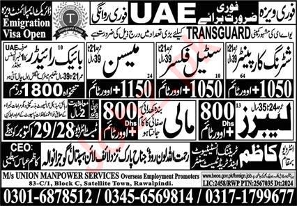MS Union Manpower Services OEP UAE, uae UAE invites applications from eligible candidates for the post of shuttering carpenter, gardener, steel fixer, mason, labor, mali and bike rider as per advertisement of October 28, 2024 published in daily Express Newspaper. Candidates with Matric, Middle, Intermediate, Bachelor and DAE etc. educational background will be preferred.