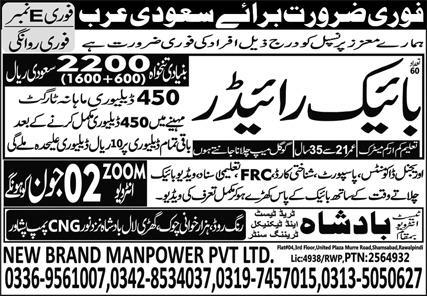 Vacant posts including bike rider are announced in New Brand Manpower Riyadh, riyadh Saudi Arabia as per 29 May 2024 advertisement in daily Express Newspaper. Candidates with Matric and Intermediate etc. educational background will be preferred.