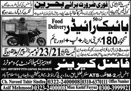 Vacant posts including rider and bike rider are announced in Final Career Overseas Employment Bahrain, bahrain Bahrain as per 18 November 2022 advertisement in daily Express Newspaper. Preferred Education is Intermediate, Middle and Matric etc.