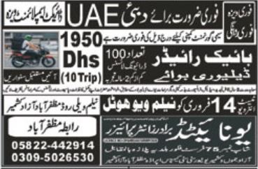 United Brothers Enterprises UBE jobs advertisement dated about 11 February 2022 in daily Express Newspaper invites application for the vacant post of rider, bike rider and delivery boy in Dubai Dubai. Preferred Education is Intermediate, Middle and Matric etc.