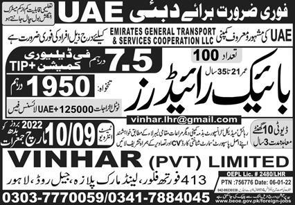 Vinhar Pvt Limited is looking for candidates for following posts as per job advertisement published in daily Express Newspaper of March 7, 2022 for location Dubai: