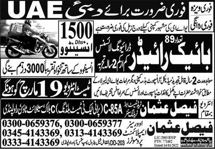 Vacant posts including rider and bike rider are announced in Faisal Usman Overseas Employment Promoters Dubai, dubai Dubai as per 17 March 2022 advertisement in daily Express Newspaper. Middle, Matric and Intermediate etc. educational qualification will be preferred.
