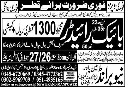 New Brand Manpower jobs advertisement dated about 21 July 2023 in daily Express Newspaper invites application for the vacant post of bike rider and rider in Qatar, qatar Qatar. Educational qualifications required Intermediate and Matric etc.