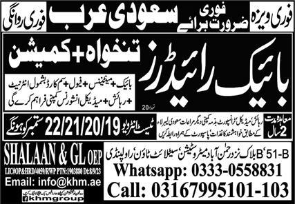 SHALAAN & GL Overseas Employment Promoters latest Overseas Driving jobs and others can be applied till 22 September 2023 or as per closing date in newspaper ad. Read complete ad online to know how to apply on latest SHALAAN & GL Overseas Employment Promoters job opportunities. Learn today skills like Motorcycle Courier, Driving and Delivery to apply confidently on these SHALAAN & GL Overseas Employment Promoters jobs. Earn more by overtime. Facilities like transport, accommodation and medical may be provided.