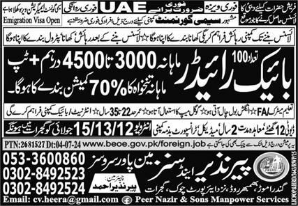 Peer Nazeer & Sons Manpower Services Abu Dhabi, sharjah UAE invites applications from eligible candidates for the post of bike rider as per advertisement of July 13, 2024 published in daily Express Newspaper. Educational qualifications required Intermediate and Matric etc.