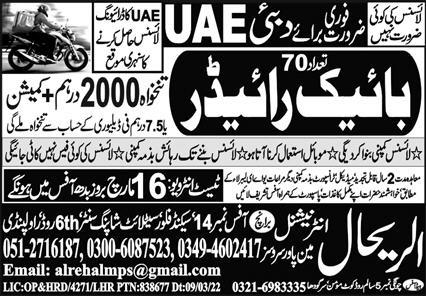 Vacant posts including bike rider are announced in Al Rehal International Manpower Services UAE, dubai UAE as per 15 March 2022 advertisement in daily Express Newspaper. Matric and Intermediate etc. educational qualification will be preferred.