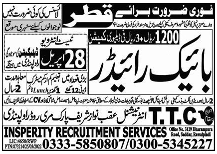 Insperity Recruitment Services jobs advertisement dated about 25 April 2022 in daily Express Newspaper invites application for the vacant post of bike rider in Qatar, qatar Qatar. Persons with Matric etc. education can apply.