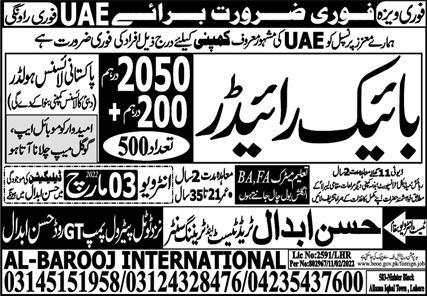 Overseas UAE, dubai UAE invites applications from eligible candidates for the post of bike rider and rider as per advertisement of March 01, 2022 published in daily Express Newspaper. Educational qualifications required Intermediate and Bachelor etc.