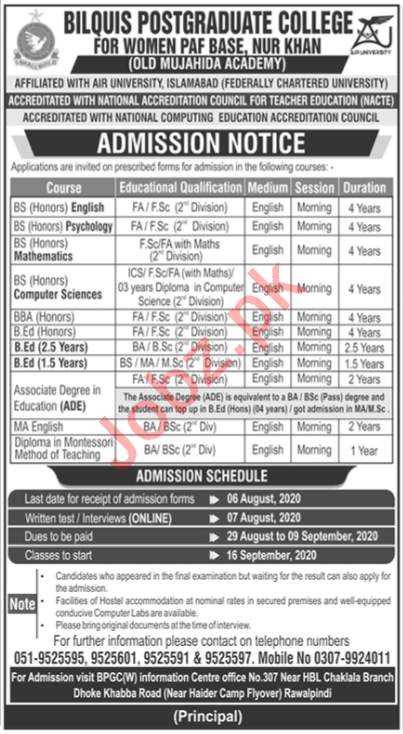 Bilquis Postgraduate College Rawalpindi, Pakistan is starting admissions fall 2020 for the classes of BA, B Sc, MA, ADE, BEd, BS Hons in English, Psychology and Computer Sciences. Read newspaper ad for exact details.