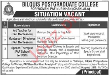 Bilquis Postgraduate College PAF Nur Khan Chaklala RWP Jobs